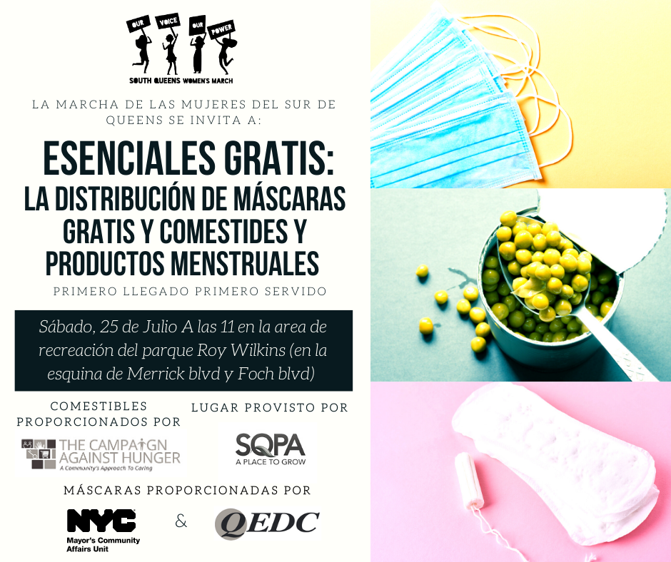 South Queens Women's March is having our second essentials giveaway on Saturday, July 25 at 11am at Roy Wilkins Park! We will be distributing free grocery bags courtesy of The Campaign Against Hunger, free face masks courtesy of Queens Economic Development Corporation and NYC Mayor's Office, and menstrual supplies (free pads and tampons) from donations to our period supply drive.